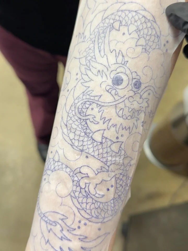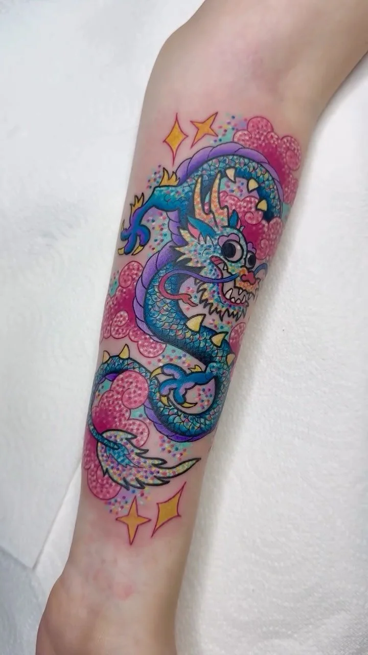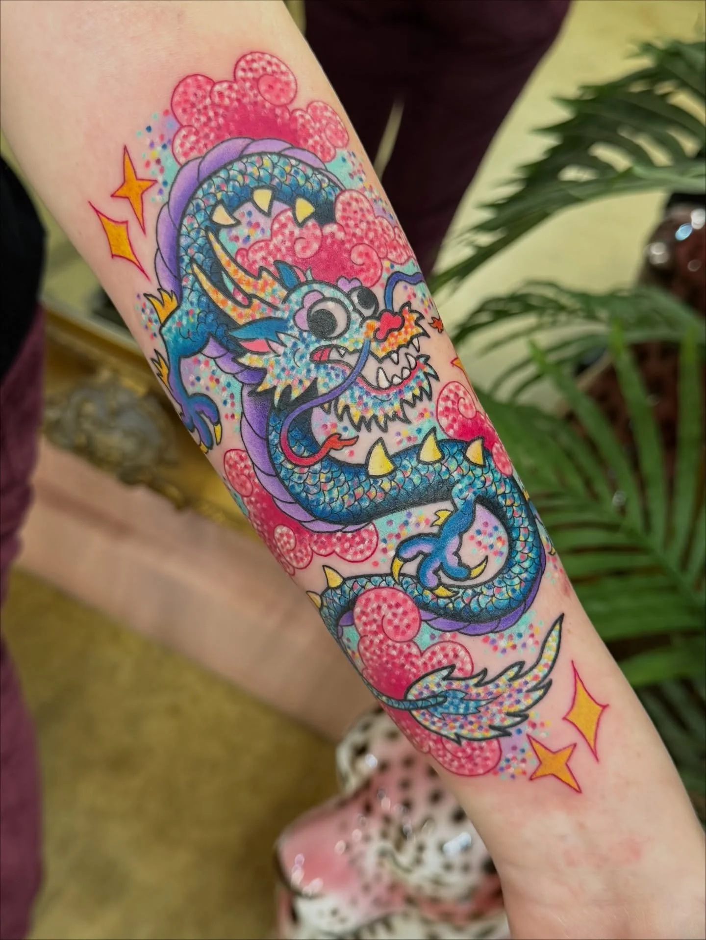 View fullsize Totally obsessed with making this for Kendal who traveled all the way from Texas 🥲🩷! Thanks so much 💜 #tattoo #kawaiitattoo #dragontattoo #glittertattoo